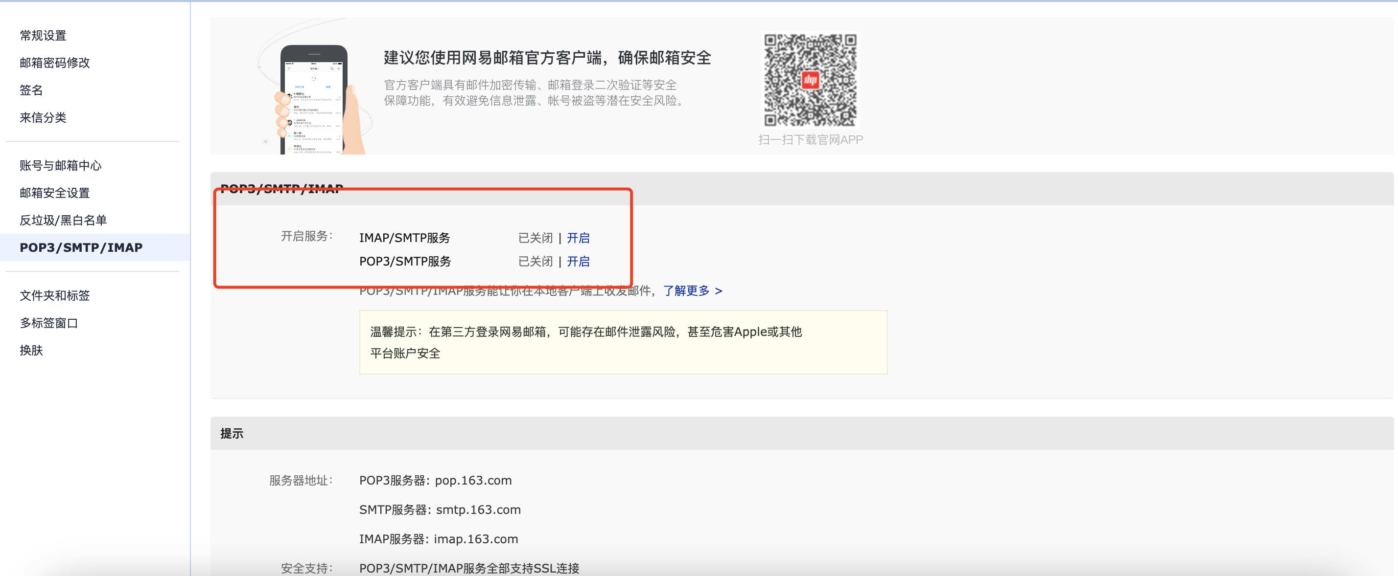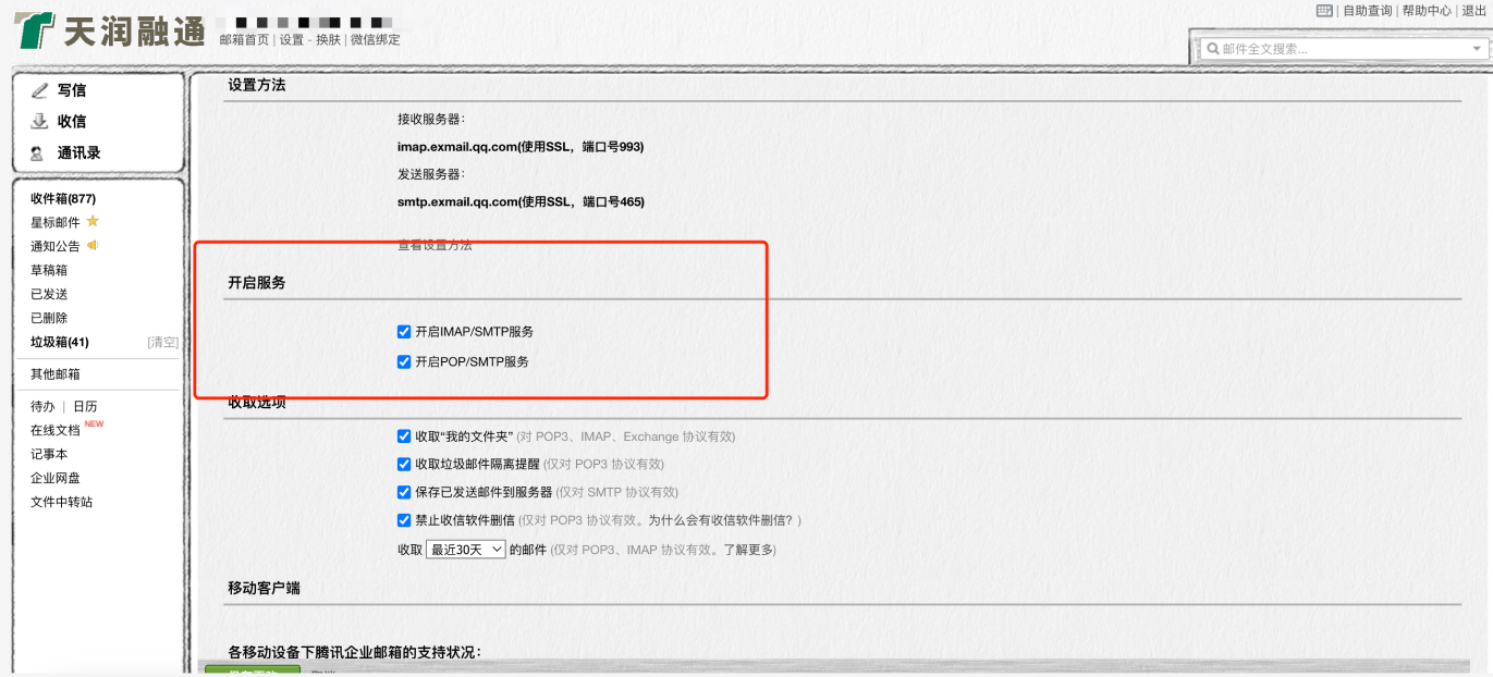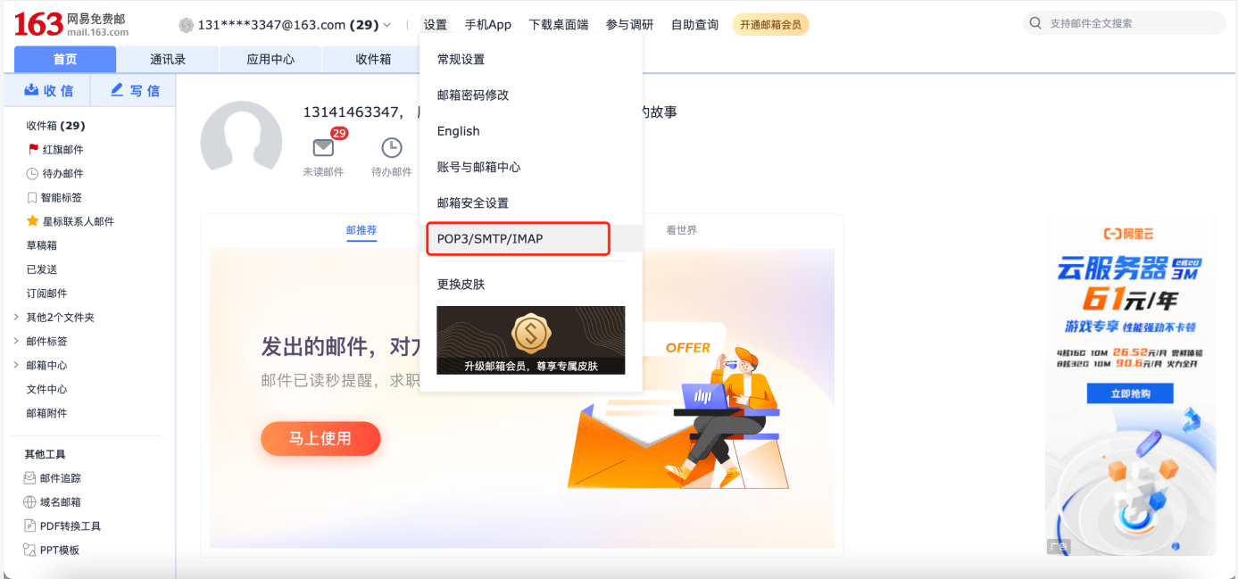 2 、点击设置中的POP/SMTP/IMAP,开启发件服务,详情可查看帮助中心