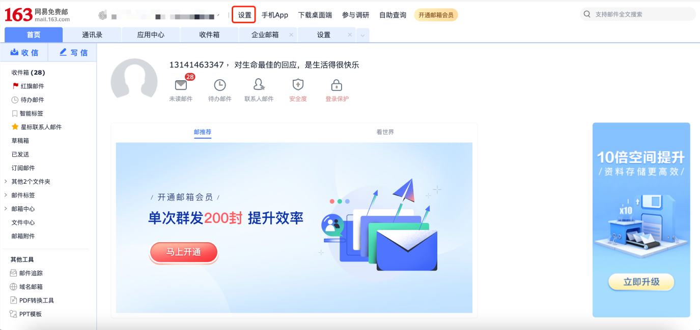 1、登录网易邮箱,点击顶部的【设置】