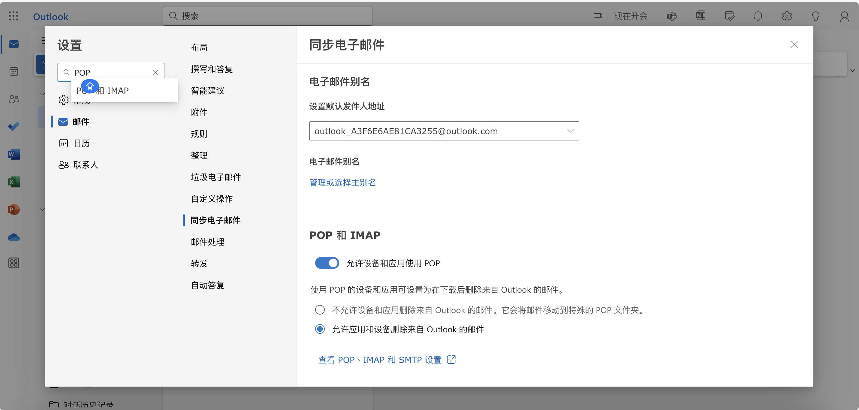 1 、登录OUTLOOK邮箱,点击顶部的【设置】,在弹窗内输入POP和IMAP,开启服务