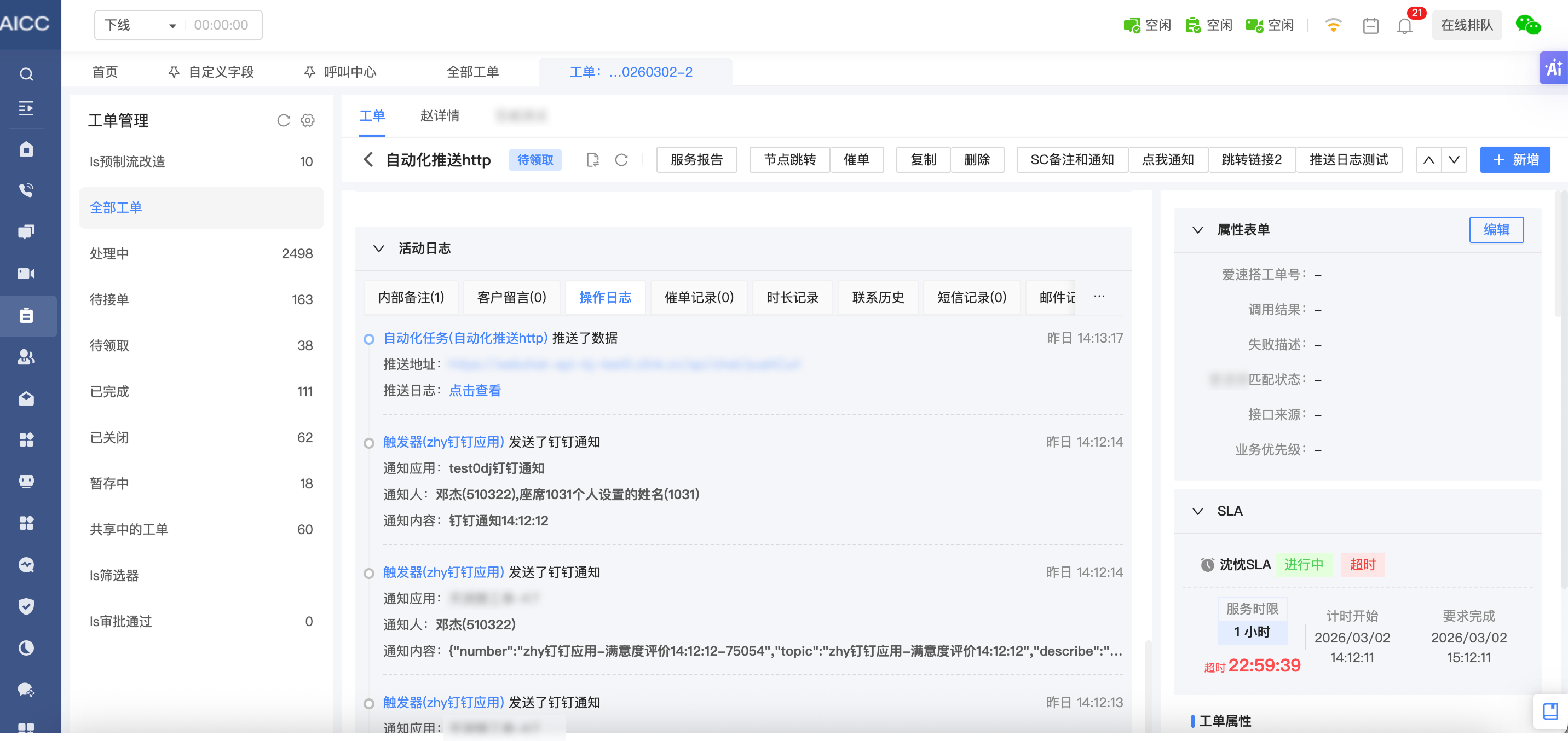 工单操作日志显示推送,通知日志