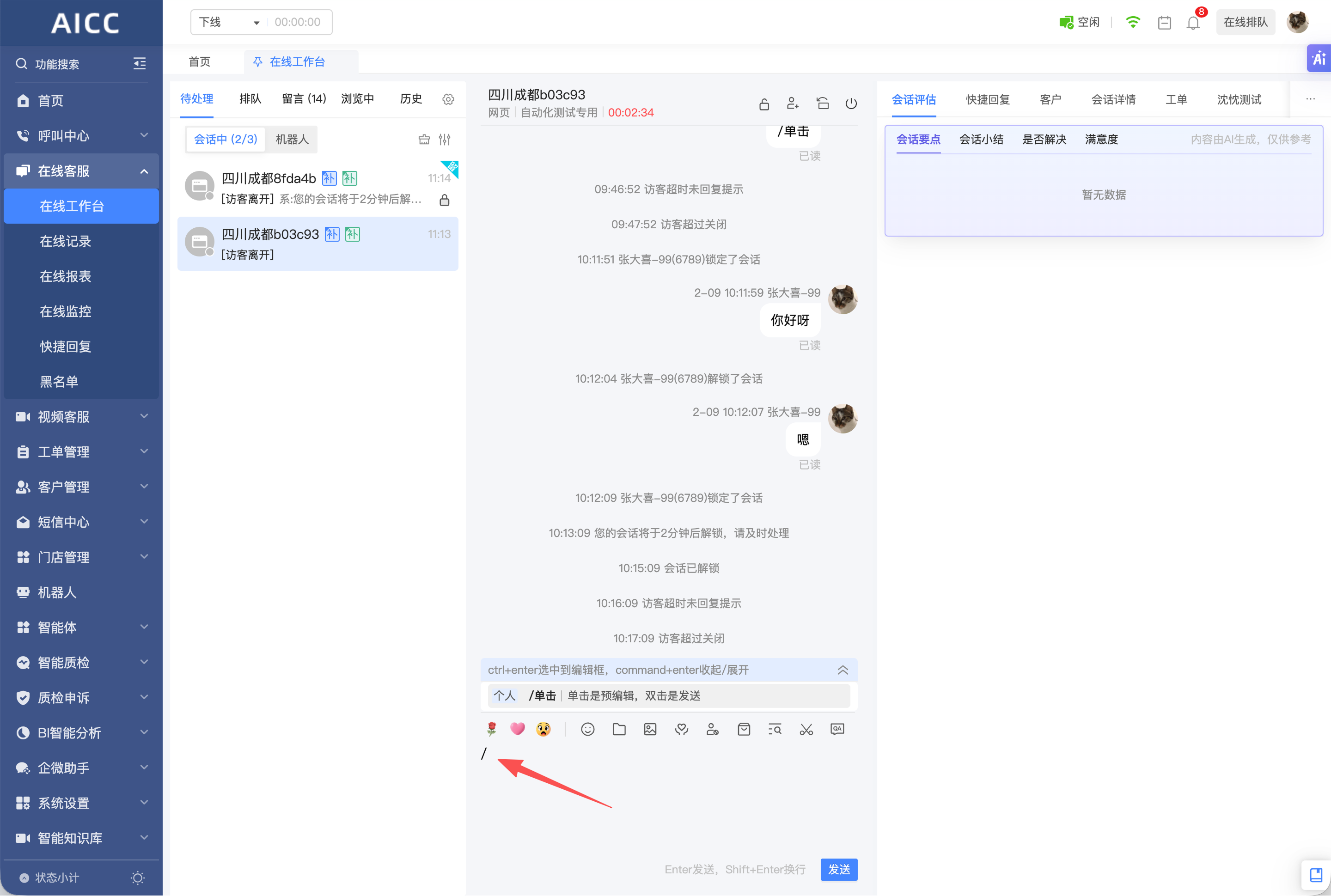 优化快捷指令使用体验:座席在工作台输入 “/” 时,系统将自动展示已配置好快捷指令的快捷回复短语,无需记忆或检索,大幅提升回复效率,降低座席操作成本。
