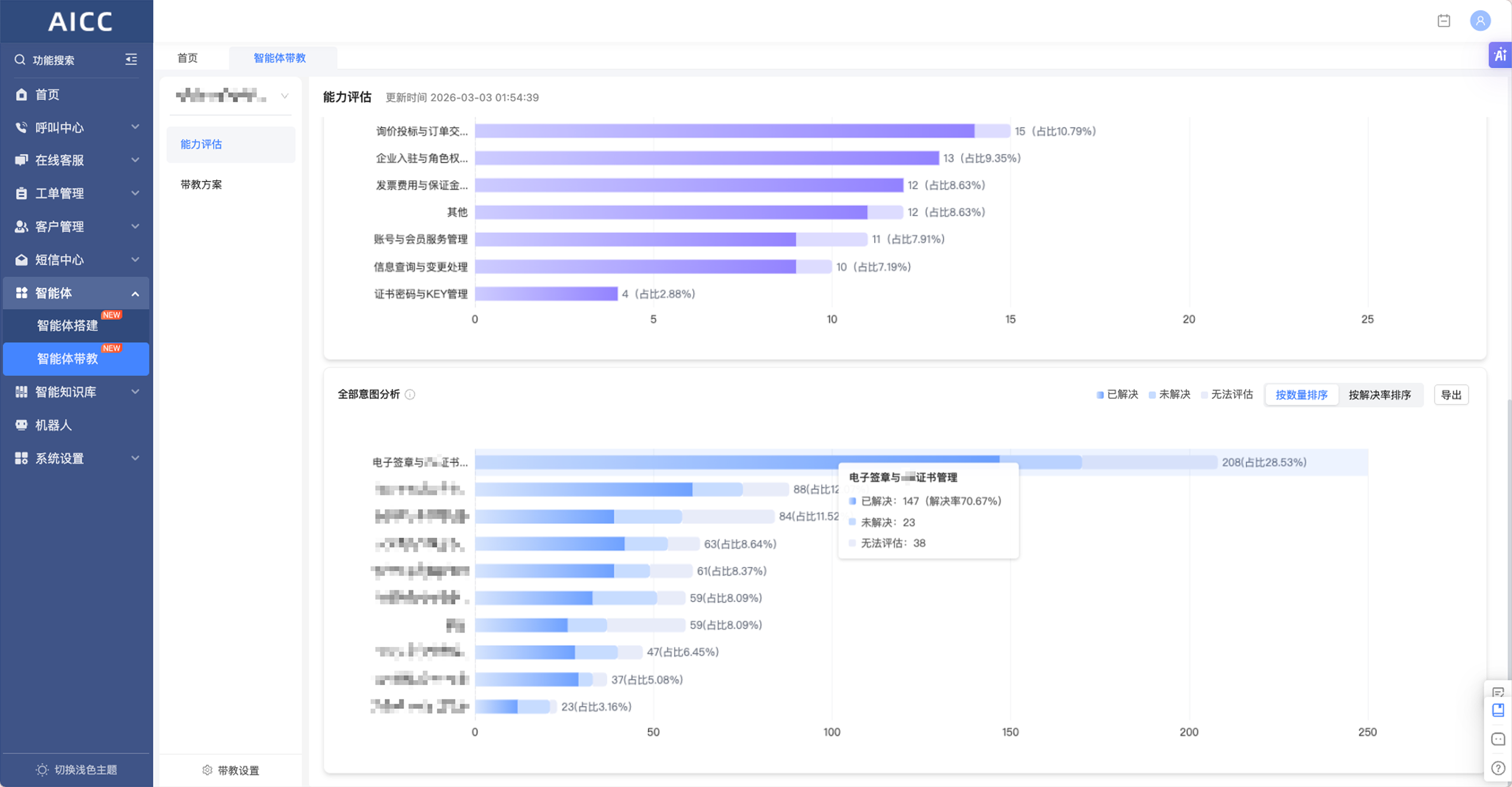 智能体带教-能力评估模块,新增【全部意图分析】报表,对所有会话统一进行问题抽取与意图分类,统计各意图的数量、占比及解决率,并支持排序与明细导出,可快速识别热点问题与低效意图,清晰呈现整体运营效果,为优化策略制定和管理汇报提供完整数据支撑。