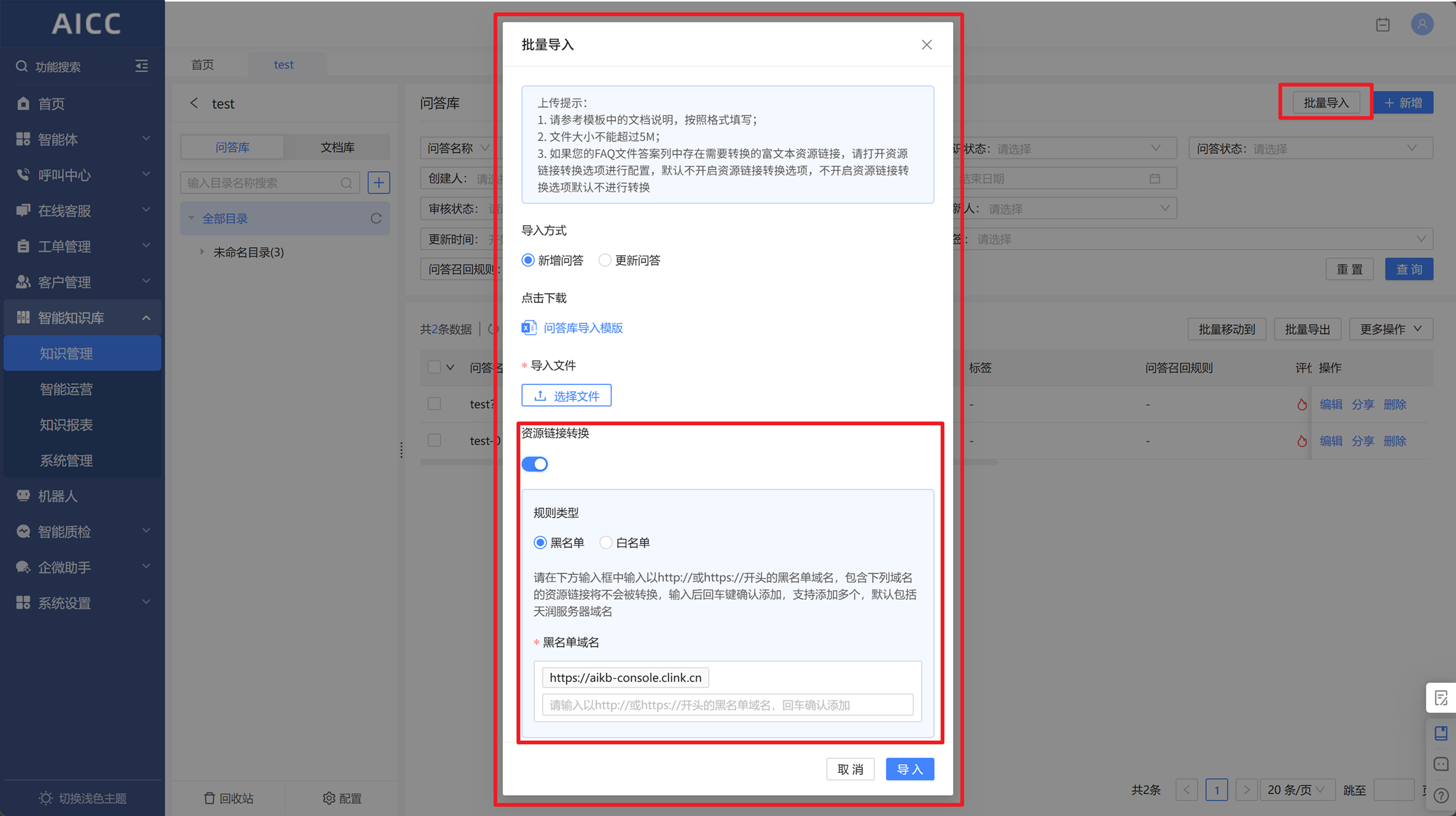在知识库迁移场景中,客户需将三方平台导出的FAQ文件导入至知识库。此前依赖人工运行脚本,操作门槛高、效率低,且缺乏标准化配置,易因执行不一致或资源下载失败影响迁移进度,本次升级在【问答库-批量导入】 中新增 “资源链接转换” 配置项,实现以下能力: